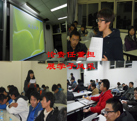 12月21日晚,10级四班携手一班和三班顺利开展了以"当今世界男人和女人哪个更累"为主题的辩论赛,场面火热生动,笑声不断。10级辅导员彭秀平老师和陈星星老师,各班代表作为评委参与了辩论赛。
