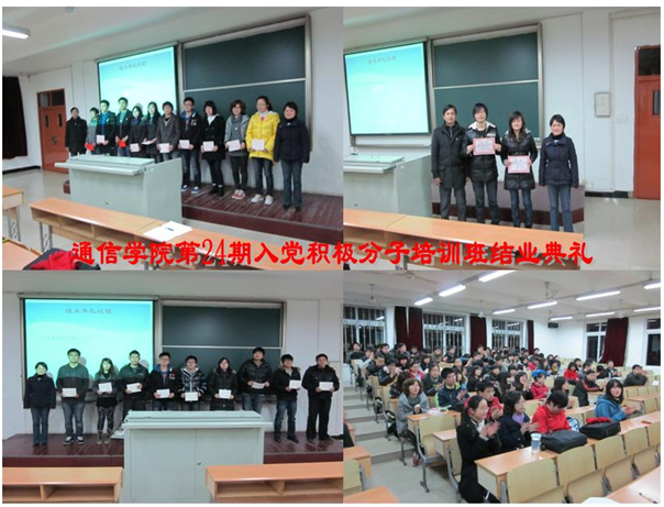 2011年2月25日晚上6:00,上海大学党校通信学院办学点第24期入党积极分子培训班结业典礼在延长校区一教201教室举行,学院党委副书记吴蔚出席本次结业典礼,顺利结业的92位学员和6名导生参加了结业典礼,典礼由办学点负责人徐群老师主持。