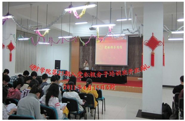 2011年4月15日晚上6时,上海大学党校通信学院办学点第二十五期入党积极分子培训班开班典礼在校本部南区社区学院307多功能厅顺利举行,本期党校新一批积极分子和本期党员导生参加了此次活动,通信学院党委副书记吴蔚出席开班典礼,开班典礼由办学点负责人徐群老师主持。