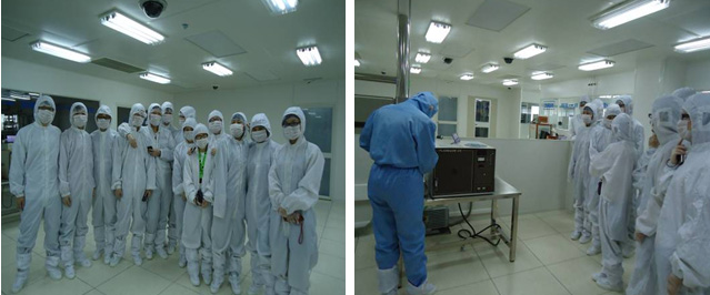 首先,同学们在老师的引导下换上防尘服、穿过风淋室,走进了集成电路制作室。接着,技术老师向同学们一一展示了集成电路的详细制作流程,包括拉锭、光刻、清洗等,以及其中涉及的各种仪器装备。同学们也积极思考,向老师提出了许多实践性、应用性强的问题,并进行了热烈的讨论。本次参观持续1个多小时。活动最后,同学们都不由地鼓起掌,对老师的辛勤讲解表示了由衷的感谢,同时合影留恋。