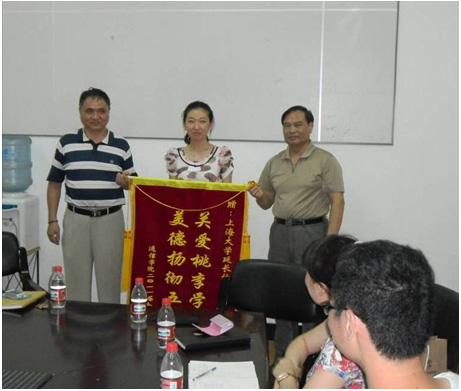 接下来,学院学管会代表全体毕业生举行了向社区"赠送锦旗"和"赠送毕业感悟光盘"的仪式,将此次的交流会推向高潮。锦旗上"关爱桃李学子,美德扬彻五洲"代表的是通信师生对于社区各位领导和管理员老师的款款情谊;光盘中刻录下的是学生们在这几年来的美好回忆。些许的赠礼承载的是学生们对社区的美好祝愿,在同学们与老师们的掌声中交流会进入尾声。
