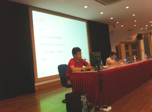 在接下来的主题报告中,王卓磊校友主要从毕业生薪酬情况、就业率、毕业生应具备的素质以及如何规划自己的职业生涯等方面向10级学生谈了一些自己的经验和看法。薪酬方面,王卓磊校友告诫10级学生:不要过于关注第一份工作的薪水,更没有必要攀比第一份工作的薪水。另外他还特意强调,大学生一定要努力提高自己的综合素质,这些素质包括个人的英语听说能力、业务能力、动手能力以及问题分析能力和问题解决能力等。讲座还着重谈到大学生应如何规划自己的职业生涯,谈起自己的经验,王卓磊校友说职业生涯就像是一场体育比赛,有初赛、复赛、决赛,一定要戒骄戒躁,掌控好自己的节奏。职业生涯首先要关注的是自己,自己想要什么,需要做什么,以及如何去完成自己的规划。