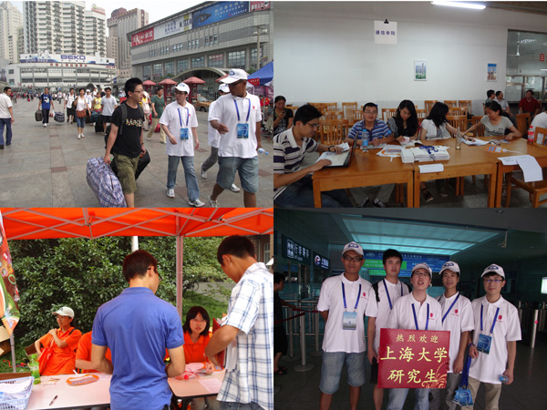 为了做好11级研究生新生的迎接工作,通信学院各级领导做了细心的安排和指导,同时我院研究生党总支副书记傅磊同学带领10级学生及学生干部也组成了迎新的志愿者队伍,开始有条不紊的展开了迎新工作,迎接来自全国各地怀揣梦想的研究生新生。其中,在火车站迎新点,程武等五名同学早早的来到了这里,热情接待每一位新生同学,并且一次次的将新生及家长接送到校门口;在学校的二食堂接待点,傅磊、王蕴慧等同学也有条不紊的开始了迎新工作,引领新生完成报到的所有程序,带领新生领取寝室钥匙并找到各自的寝室;对于有需要帮助的同学,志愿者们顶着炎炎烈日,忍受着高温酷暑来帮助新生提行李包裹。每一个志愿者都坚持奋战在自己的岗位上,忙得不亦乐乎,看到学弟学妹们顺利入校,他们脸上都洋溢着开心的笑容。