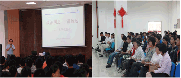 接下来的话题延展到了当代大学生的群体和个体目标,该话题确实也曾让同学们在高考之后产生过困扰——从社会传言到媒体的报道,人们常有的那种倾向的质疑给了他们一些压力;而初涉校园的不适应同样也造成了"彷徨、迷茫、忙碌、莽撞"的现状。而通过陆老师的讲述,同学们明白了大学校园环境的天然优势,也明白了师长的用心和个人应该有的规划,有了新的力量、新的支点,也更清楚自己的定位和责任。而陆老师个人的体会和告诫,平和的话语和神情,亦是面对大学生活,处理好学习生活的方方面面中不可多得的一笔财富。