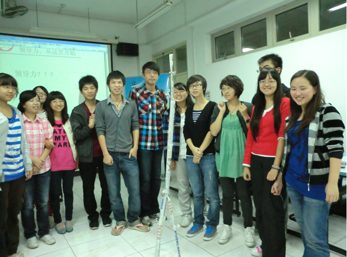 课程之初,老师先向大家提出了"领导力是什么"的问题,然后请现场同学回答,各抒己见。然后老师从同学们的话语中提炼出领导力的具体表现形式,比如平易近人、讲信用、对团队有具体规划或前进方向等等,老师对此进行了总结。接下来,老师组织同学们分成两组,进行建高塔比赛,每组发5张报纸,然后通过共同努力搭建起一座"塔",比一比哪组的"塔"更高。比赛开始,大家展开了激烈讨论,并通过一次次尝试验证想法。在最后的十几秒中,"高塔"终于完成。比赛结果其实并不重要,重要的是要培养团队默契,老师也在旁边观察团队的核心人物,让大家评选出自己认为最具领导力的人。从这一件事上就可以看出领导力发挥的极大作用。最后,老师让同学们重新对领导力发表自己的观点,同学们各抒己见,提出了很多自己的独到见解。