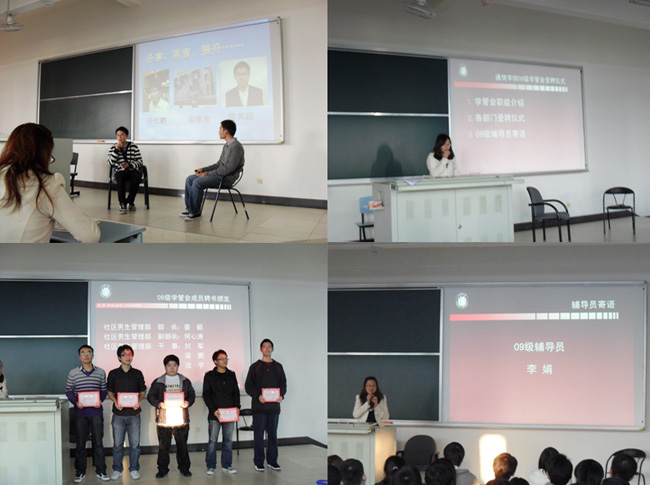 开学典礼的第二部分是09级通信学管会受聘仪式。仪式开始前,在新任学管会主任范子展的主持下,办公室主任赵真灵,党建工作部部长戴俊,文体部部长张天然,学术部部长江涛、社区管理女生部部长秦鹏燕以及社区管理男生部部长姜毅依次上台发言,阐述了各个部门的主要职能以及工作展望。各部都结合大三这一特殊的时间段,既做了学习上的规划,又加强了社会实践与组织工作的分量。