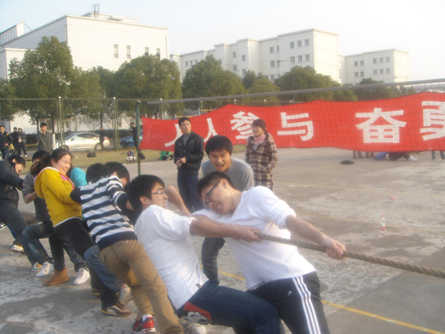 本次活动的项目有六人七足、踢毽球以及拔河比赛。每个班级都积极踊跃的组织同学们参加比赛,并且同学们对本次活动的热情也相当高。六人七足的比赛首先进行。每个运动员齐心协力,都赛出了好成绩,其中8班在激烈的竞争中勇夺冠军,12班和10班分别获得亚军和季军。毽球比赛也是很热门的活动,6班以绝对的优势夺得冠军。最后的拔河比赛,同学们斗志高昂,拿出全部的力气争取能为班级夺得好成绩,决赛中2班全班同学都拿出了全部的力量,在"1、2、3"的呐喊声中,运动员全部力量都灌注于两只手上,但因实力上得差别,惜败给12班,但同学们为班级争光的精神让每个人都感动。