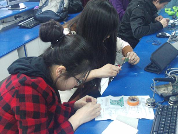 冯玉田老师给大家分发了零部件,并简单讲解了焊接技巧。同学们两人一组,拿出电烙铁、焊锡棒,开始按照说明书焊接零部件。有的同学对元器件区分不是很清楚,冯老师就到学生的位置上来做一一讲解。焊接出问题了,冯老师会指导大家如何找到问题的源头。