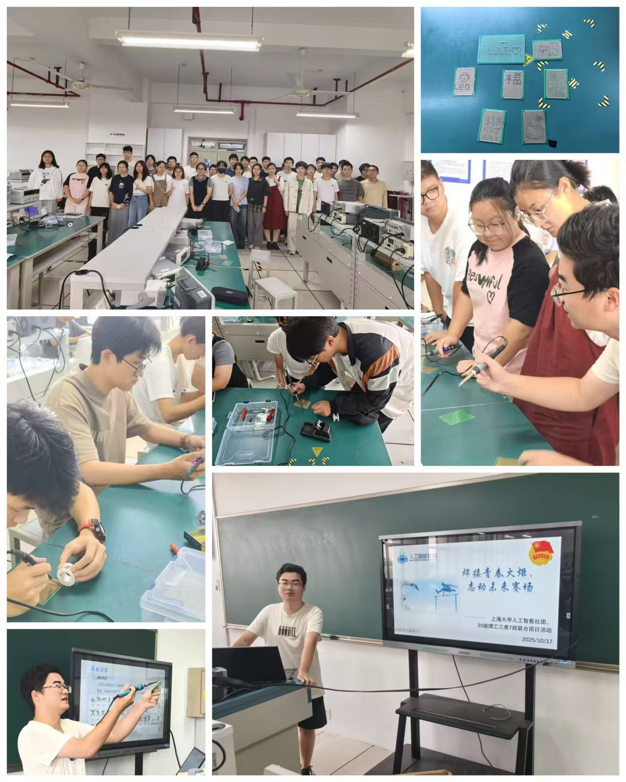 10月17日下午1点至3点,上海大学人工智能社团与理三7班在翔英大楼T406教室联合举办了“主题焊接体验日”活动。整场活动在轻松而专注的氛围中顺利开展,既有严谨的教学指导,也充满动手实践的乐趣,让每位参与者在焊锡与电路板的交织中,体验到创造的成就感。
