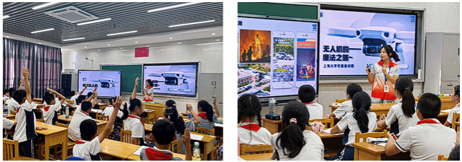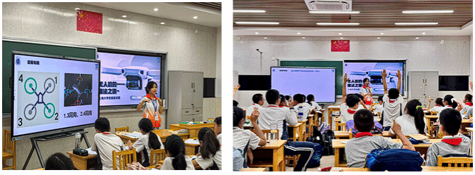 从认知到实践,同学们跟随主讲人的讲述,了解了无人机的发展历程,并重点认识了民族品牌的骄傲——大疆无人机。大疆的成长故事让同学们心潮澎湃。大家深刻体会到,每一架翱翔的无人机背后,都凝聚着无数科学家、工程师的智慧、勇气与坚持不懈的探索精神。