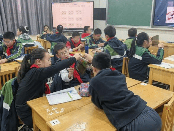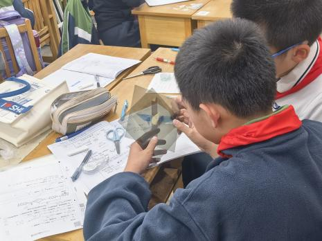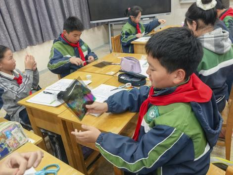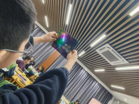 最激动人心的环节到来——通过偏振片、透明胶带和塑料片等简单材料,同学们就可以动手创造属于自己的光影魔术。在沈萌的引导下,同学们将不同宽度、不同层数的胶带以特定角度贴在塑料片上,制作成“感光画板”。当这片自制的画板被夹在两片偏振片之间,并轻轻旋转上方的偏振片时,奇迹发生了:原本无色的胶带区域瞬间焕发出彩虹般绚烂的色彩,且色彩随着旋转而变化万千。每一位同学都成功变身光影魔术师,在亲手实践中深刻理解了偏振光如何通过应力产生绚丽色彩,感受到了科学与艺术交融的奇妙。教室里惊叹声此起彼伏。每一位同学都成功创造出了独一无二的光影画,真正成为了能够驾驭光、创造色彩的“光影魔术师”。