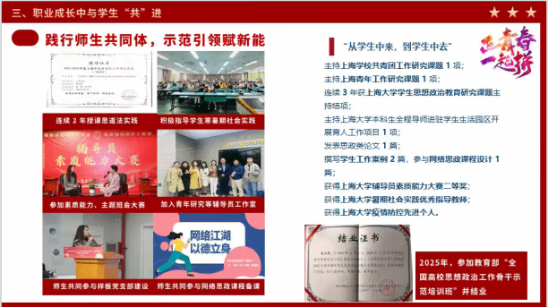 作为学生成长路上的引路人,李文华老师始终坚持“先做一步”,做好学生们的榜样。与学生共学共研,她参与社会实践指导与课程教学,带领学生团队开展社会调研,成功结项2项团市委课题;在支部建设中,指导学生共建共创,支部连续三年获得党建项目立项、学校优秀主题党日等;动员学生共同参与网络思政课程设计,提升网络道德素养。