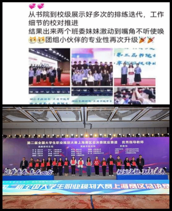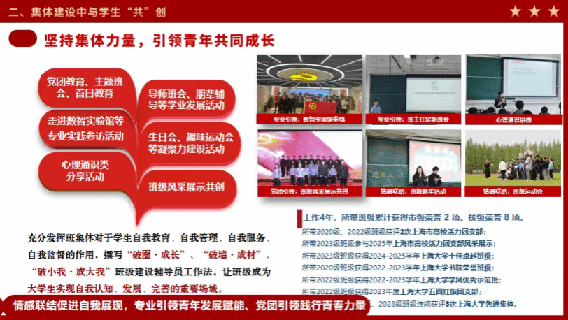 用心指导所带班级,她带领班级走进上海数智体验馆,开展趣味运动会等凝聚力建设活动,组织开展导师班会、朋辈辅导等学业发展活动,邀请心理老师开展通识类分享,在深夜与学子们一次次“风暴”卓越班级风采展示的设计与排练,共创的氛围让班级同学拧成一股绳。入职以来所带班级2次获得市高校活力团支部,同时获得校卓越班级、校五四红旗团支部等荣誉。