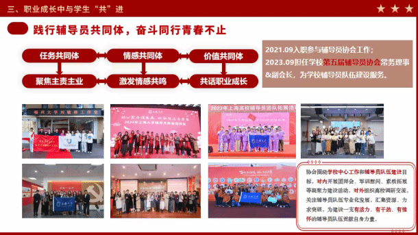 她始终坚持加强职业素养,积极参与学校辅导员素质能力大赛、主题班会比赛、加入辅导员工作室、撰写育人工作案例……充分发挥辅导员共同体共创的力量。坚持与队伍融合并进,李文华老师在入职时便加入学校辅导员协会,围绕学校中心工作和辅导员队伍建设目标开展多项活动,为建设一支有活力、有干劲、有情怀的辅导员队伍贡献自身力量。