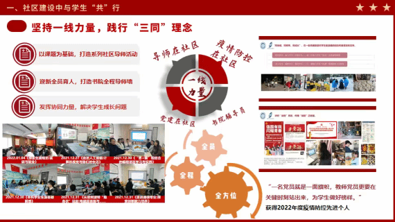 担任社区辅导员的工作经历,让她延续了在一线学生社区与学生同频共振的工作思路,入职主持了全程导师入驻学生社区项目课题,在社区组织开展6场导师活动,获得了师生们的积极响应;疫情防控期间,她全程100多天在社区与学子们同吃同住,积极组织和带动学子们共克时艰。