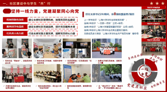 承担党建工作后,她继续推动党建进社区,建立支部社区管理机制、组织党员在社区亮身份、定期开展社区组织生活;打造主题知识竞赛、行走的党课等生动的实践主题教育;项目制的支部建设方式,极大提升了支部成员的领导力与组织力,支部多数成员担任校院级组织主要学生骨干并赢得师生好评。