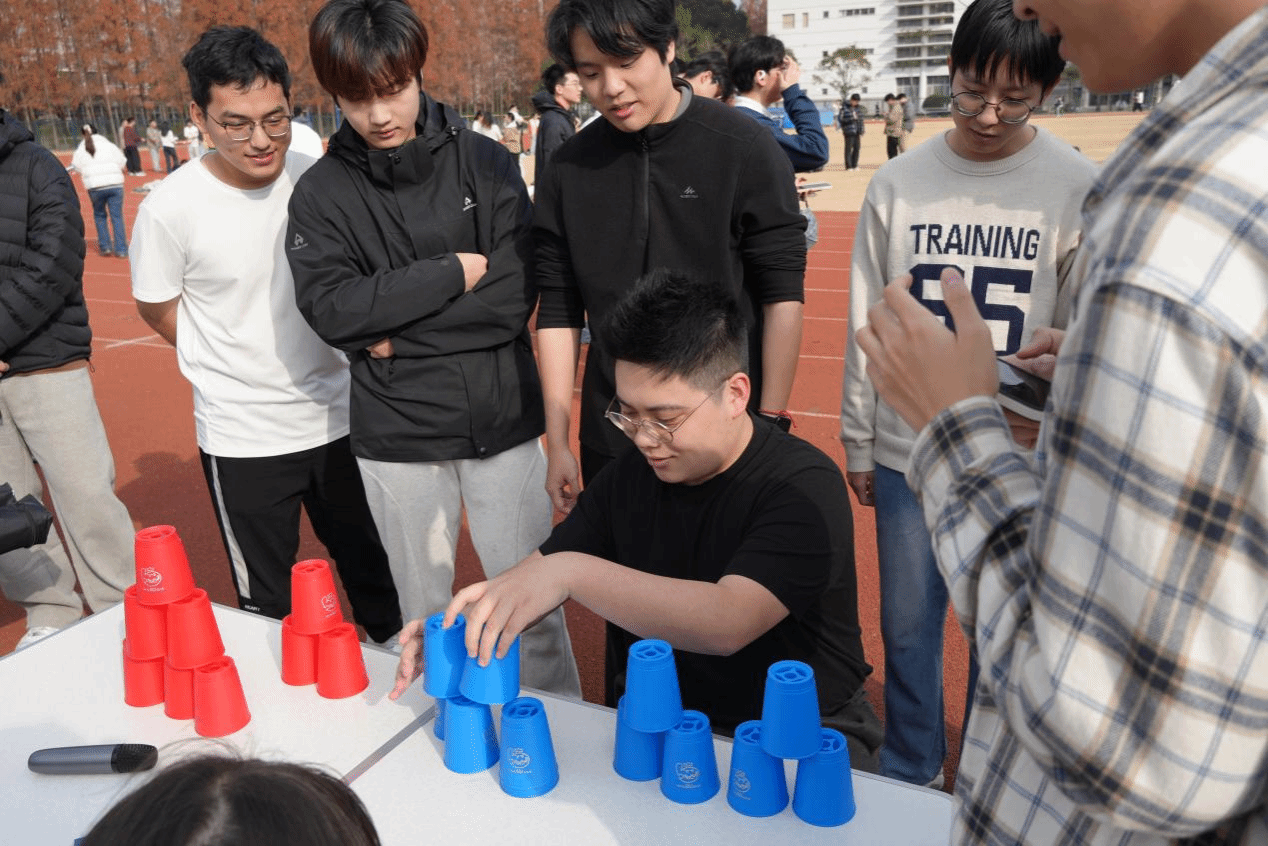 “巧夺天工”速叠杯接力赛同样考验协作能力,12人接力完成3 - 6 - 3叠法与还原,选手们争分夺秒、动作流畅,高效地衔接让简单的叠杯变成团队默契的展示。