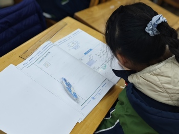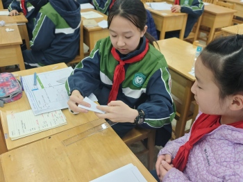 课程开场,宣讲团成员刘天启以有趣尺子的实验激起同学们的兴趣:在直尺上覆盖一张A4纸,使用小球撞击直尺而直尺却不掉落。这一反直觉的现象瞬间引发了同学们热烈的讨论:“为什么尺子没有被弹飞呢?”。主讲人刘天启并未直接给出解答,而是带领同学们亲自动手尝试,在反复尝试中观察尺子在小球砸落时是如何运动的。在不断的尝试和观察过程当中,小朋友们惊奇的发现到:“尺子翘起来了但是没有被弹飞,反而被纸‘压下去了’。”这一神奇的现象吸引着小朋友们开展更加好奇深入的思考,为什么一张薄薄的A4纸竟能让尺子在小球砸下时不掉落?