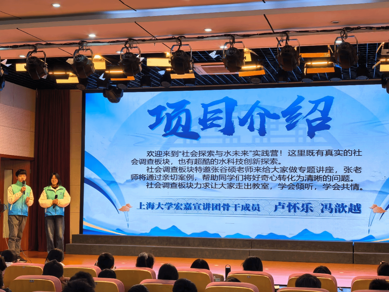 2026年1月23日,冬日的寒意挡不住探索的热情。上海大学宏嘉宣讲团携手上海师范大学附属宝山经纬实验教育集团、上海大学环境与化学工程研究生联合会,共同开启了“社会探索与水未来”寒假实践营的序幕。本次活动以“大中小一体化”育人为纽带,贯通高等教育与基础教育资源,让大学的科研实践与中小学的探究学习深度融合。宏嘉宣讲团成员走进中小学课堂,引导孩子们从身边的问题出发,不仅学会了如何开展社会调研,更在与研究生、大学生团队的交流协作中,深入探索了水资源的科学奥秘。通过大学、中学、小学多方联动,本次实践营为青少年搭建起连贯的科学素养培育阶梯,生动演绎了协同育人、全程育人的教育新生态。