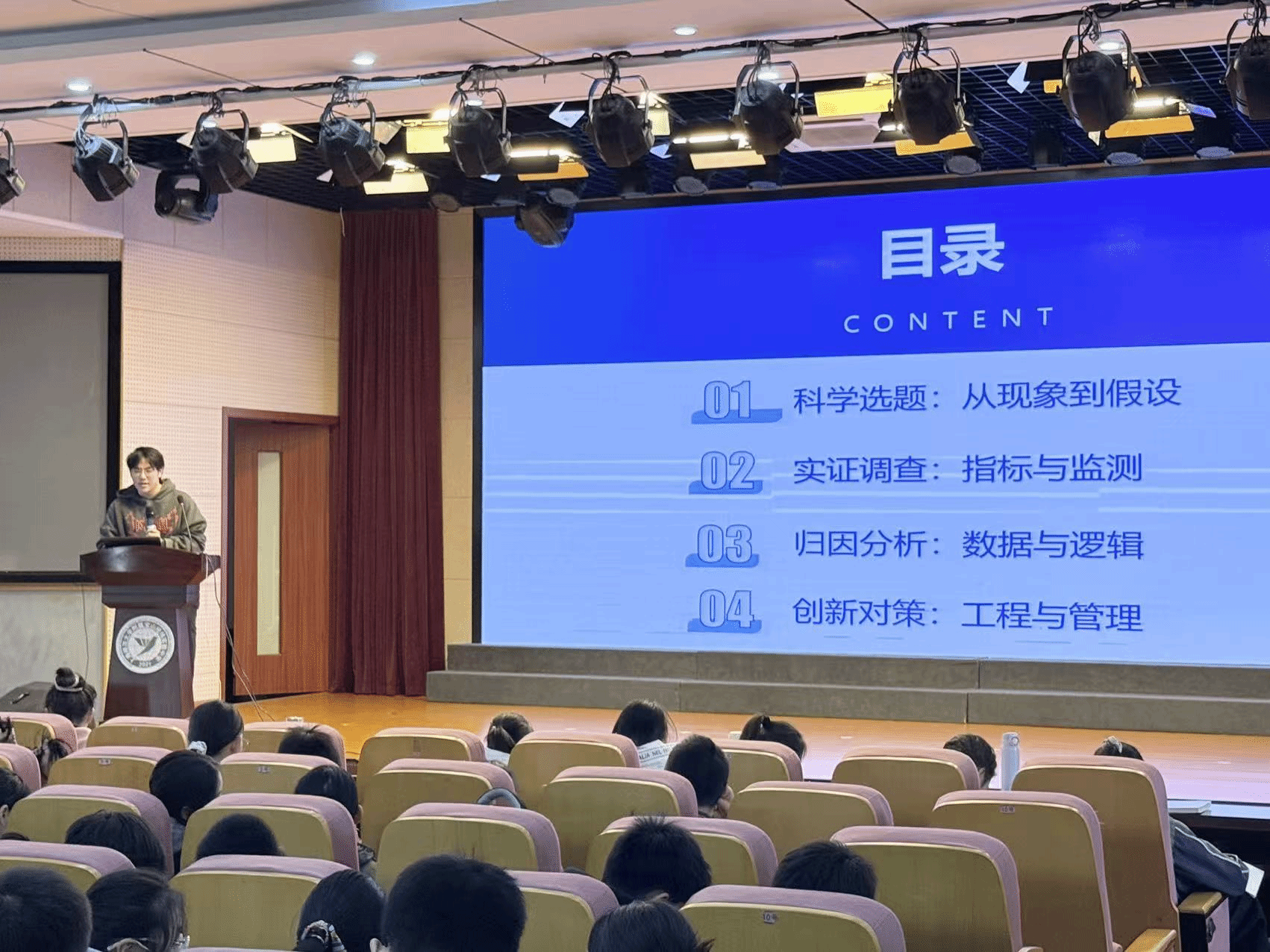 为了让营员们系统理解水调研的路径,许斌同学以《水科学研究:从环境调研到科学实证》为题,首先系统阐述了水调研的四大核心维度与黄金法则。随后,他聚焦方法论,逐层拆解了“选题-设计-收集-分析-展示”这一完整五步流程,并辅以生动的校园案例,引导营员们完成从发现问题到构思解决方案的完整闭环。
