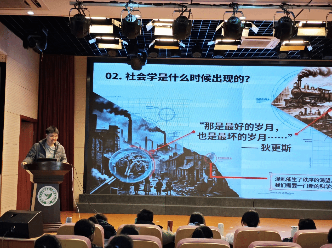 为了启发学生从生活中主动发现问题,上海大学社会学院博士研究生张谷硕带来了题为《带着问题出发:寒假社会调研怎么做?》的专题讲座。他从“生活并非理所当然,而是可以被发现、被理解”这一观点切入,结合贴近学生实际的生动案例,系统阐述了如何通过“提问—观察—记录”的社会学方法,理解身边的社会现象。张谷硕博士不仅引导学生掌握了社会调研的基本路径,更鼓励他们以科学视角看待日常,在实践中融合学习与兴趣,使社会调研成为一段充满乐趣的探索旅程。