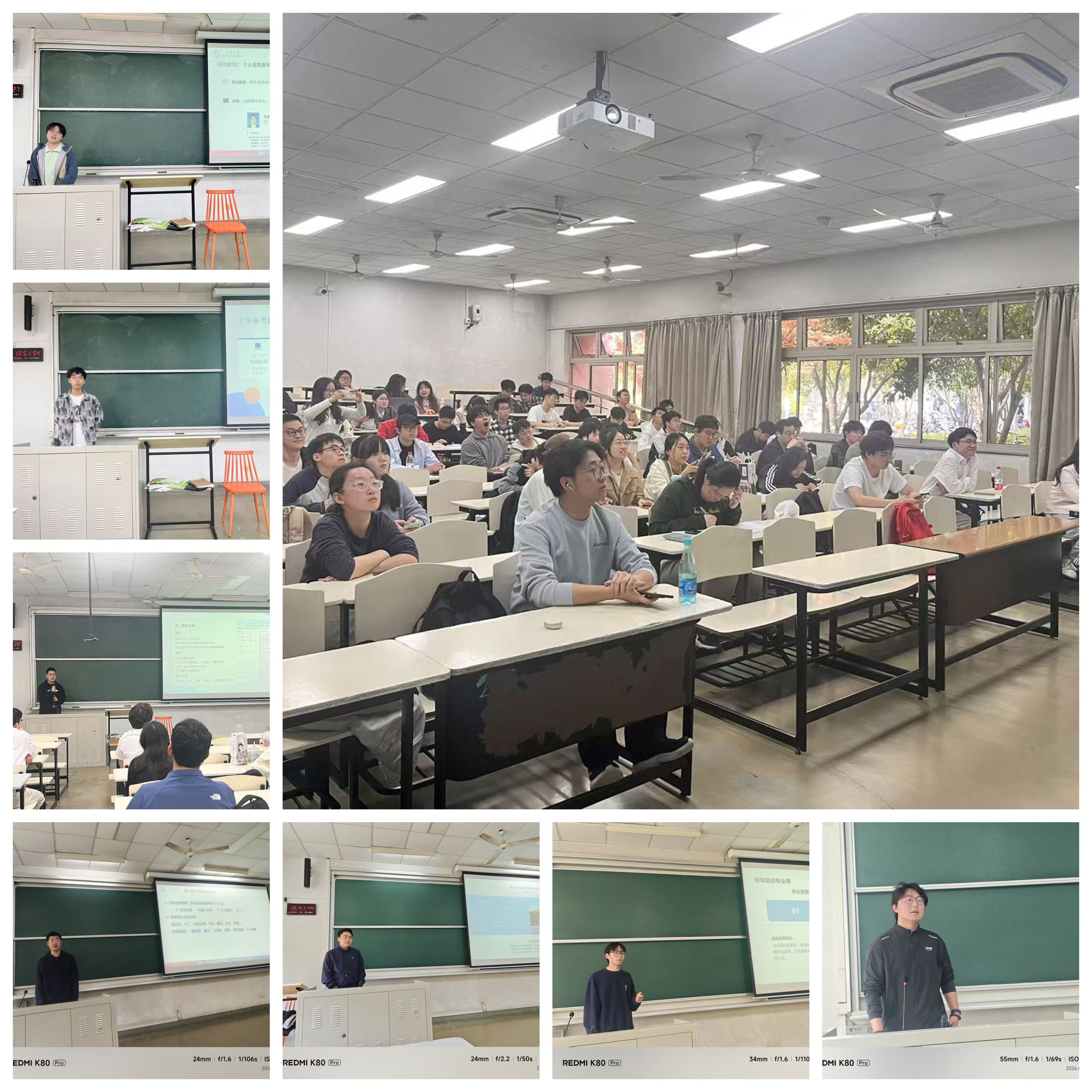 卫佳翌学长结合自身考研上海大学的经历,带来贴合本校备考的实用经验,与前一位学长的分享形成互补。他同样围绕择校思路、各科复习技巧、复习工具选用等内容展开分享,数学方面注重错题复盘整理;英语坚持每日词汇积累与精读训练,灵活运用写作素材;专业课聚焦教材核心考点,结合历年真题梳理知识脉络,针对性突破重难点。此外,他提醒在场同学,切勿低估考研本校的难度,无论目标院校层次如何,都要保持严谨认真的态度,结合自身学习节奏合理规划时间,制定科学可行的备考计划,稳步推进复习进度。