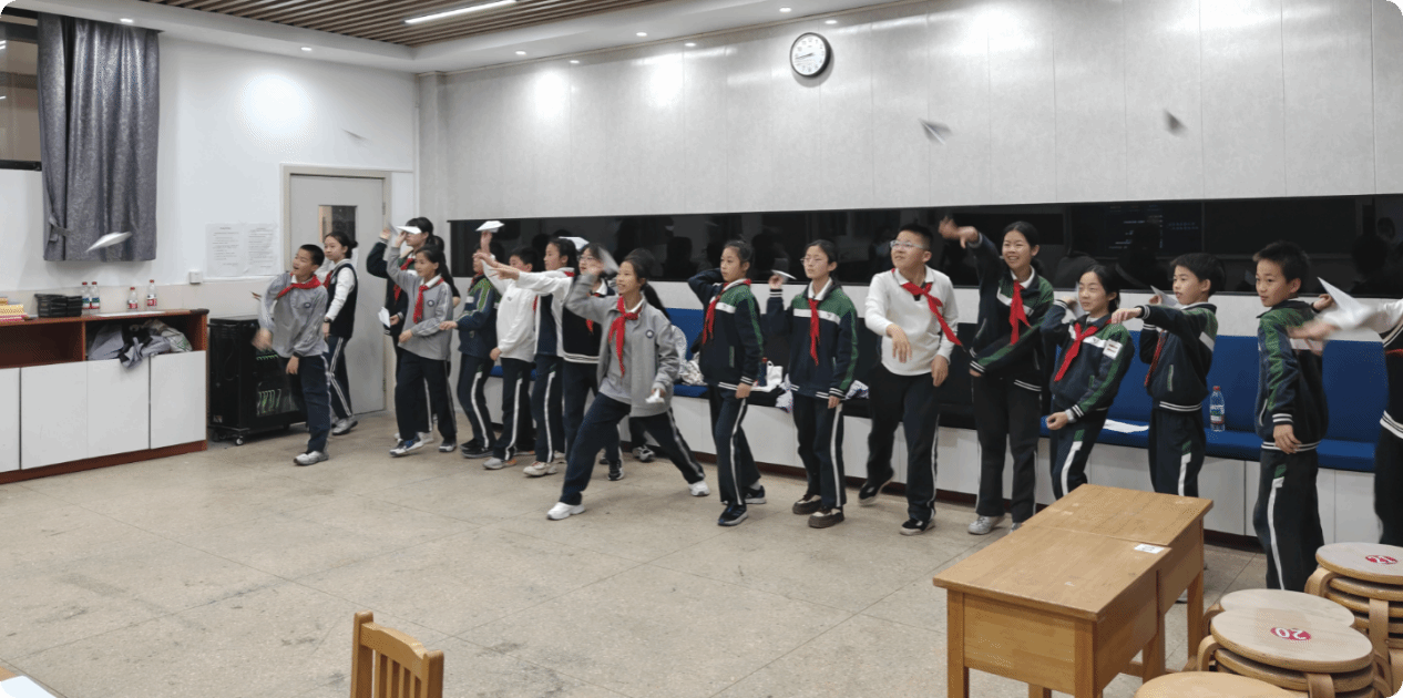 理论知识学完,动手时间到!同学们运用课堂上学到的方法,亲手折起属于自己的纸飞机:加重机头、确保左右对称、让机翼微微上翘呈浅V形。随后,大家来到教室过道,展开了一场热闹的对比试飞。纸飞机在空中划出弧线,有的稳稳飞过讲台,有的盘旋落地,引来阵阵欢呼与讨论。在一次次投掷与调整中,同学们真切感受到了空气动力学的魅力。