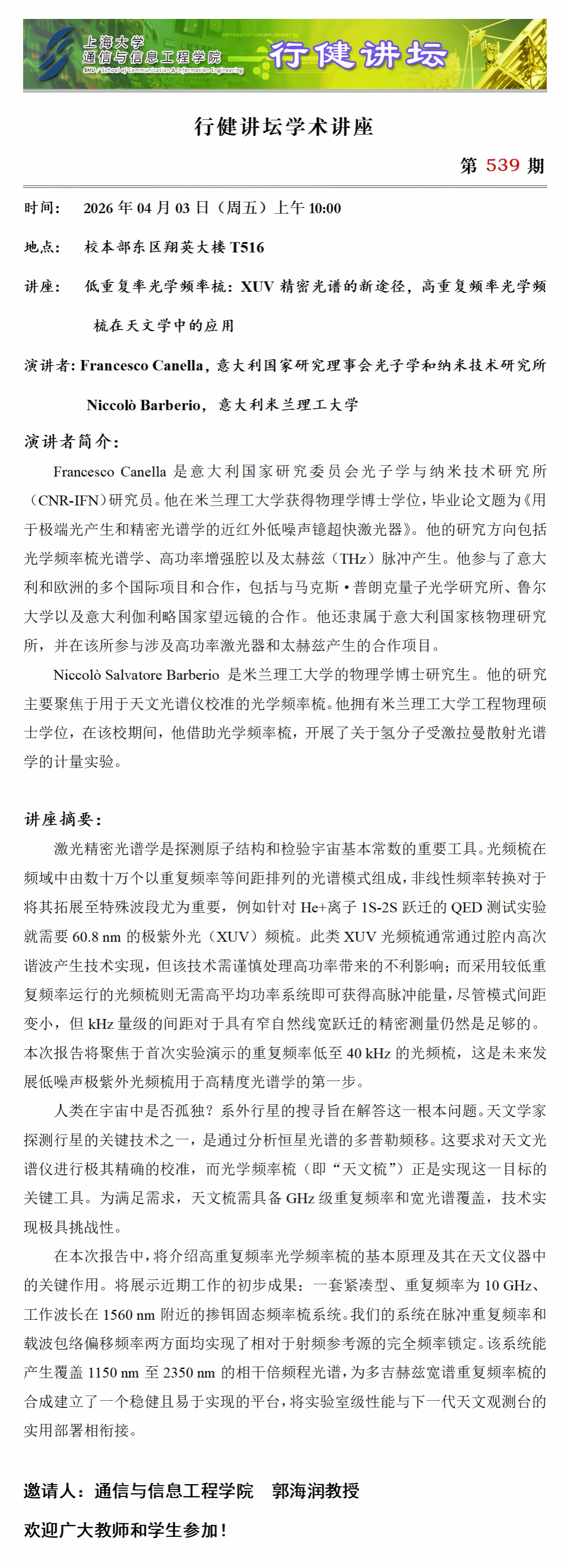 上一条:行健讲坛 №540 -视频流媒体和健康人工智能 下一条:行健讲坛 №538 -基于拉曼放大的超宽带传输技术